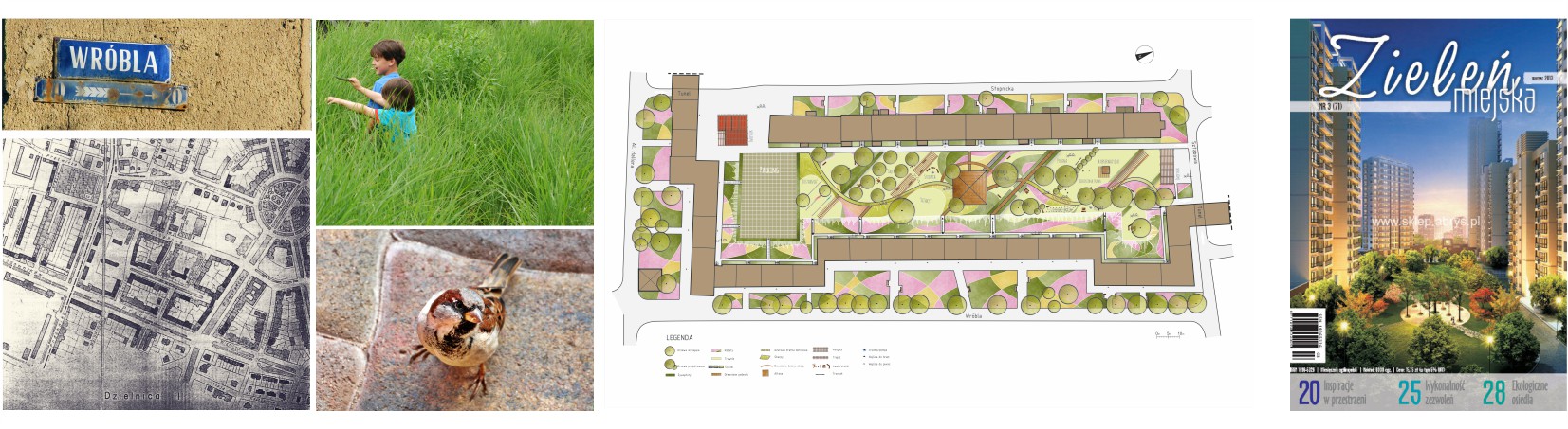 Powiększono parking, a pojemniki na odpady komunalne oraz pojemniki do segregowania odpadów przeniesiono na obrzeża terenu. Z myślą o mieszkańcach zostało zachowane również miejsce do suszenia prania oraz zainstalowano pompę wodną ułatwiającą podlewanie terenu. Cały obszar łączy malownicza ścieżka-wstęga, której charakter zmienia się w zależności od lokalizacji. Aby podkreślić naturalistyczny klimat wprowadzone zostały drzewa i krzewy owocowe, trawiaste i łąkowe polany oraz pachnące zioła. Duży nacisk położono na rośliny nie wymagające ciągłej opieki i nawadniania. Teren nie posiada typowego placu zabaw. Proponuje się umieszczenie elementów zabawowych w różnych jego częściach, zachęcając dzieci do odkrywania i poznawania nowych zakątków. W konsekwencji działania te pozwoliłyby na scalenie i wykreowanie nowej jakości otoczenia.