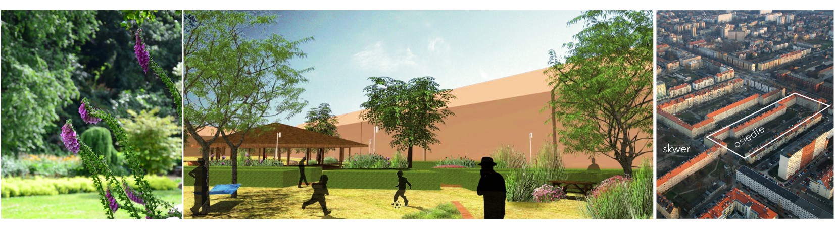 Eko osiedle. Koncepcja zakładała częściowe przeprojektowanie dotychczasowej komunikacji poprzez zlikwidowanie zużytej asfaltowej alei oraz zastąpienie schodów pochylniami dla osób niepełnosprawnych, wózków i rowerów. Według tego założenia planowano zwiększenie powierzchni biologicznie czynnej, wykorzystanie roślinności rodzimej i zadomowionej oraz mieszanki trawnikowej z mikro koniczyną (Microclover®). Uwzględniono również racjonalne gospodarowanie wodą opadową. Dostrzegając zalety tego typu działań, zaproponowano rozwiązanie w małej skali, nieznacznie ingerujących w teren czyli zbiorników przy rynnach. W przypadku bardziej skomplikowanego rozwiązania, mogłaby na ten temat powstać odrębna, szczegółowa koncepcja projektowa.