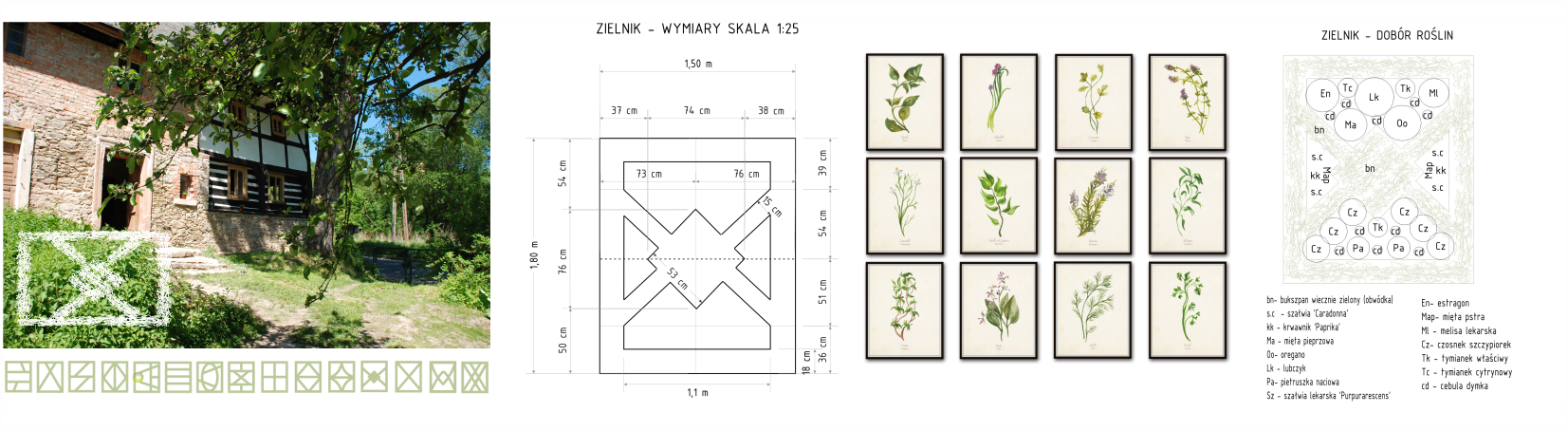 Pomiędzy dwoma biegami schodów wejściowych do budynku, w miejscu bardzo dobrze nasłonecznionym i reprezentacyjnym, został zaprojektowany w bukszpanowych obwódkach elegancki detal w postaci zielnika. Ponieważ jest to miejsce bardzo wyeksponowane i jednocześnie położone blisko domu i kuchni, powstał pomysł eleganckiego ujęcia go w bukszpanowe ramy, które nawet w zimie, pod warstwą śniegu, będą się pięknie prezentować. Jednocześnie bliskość domu i dostęp dużej ilości słońca zaowocowała nadaniem temu malutkiemu ogródkowi funkcji praktycznej a nie tylko ozdobnej. Znaleźć się tu powinny najbardziej potrzebne w kuchni rośliny, z naciskiem na te, które są wieloletnie. Równocześnie zastosowanie ozdobnych tabliczek z nazwami roślin dodatkowo udekoruje grządki. Tabliczki mogą być również pomocne dla gości, którzy chcą z zielnika korzystać w sposób praktyczny a nie mają dobrej znajomości roślin jadalnych.