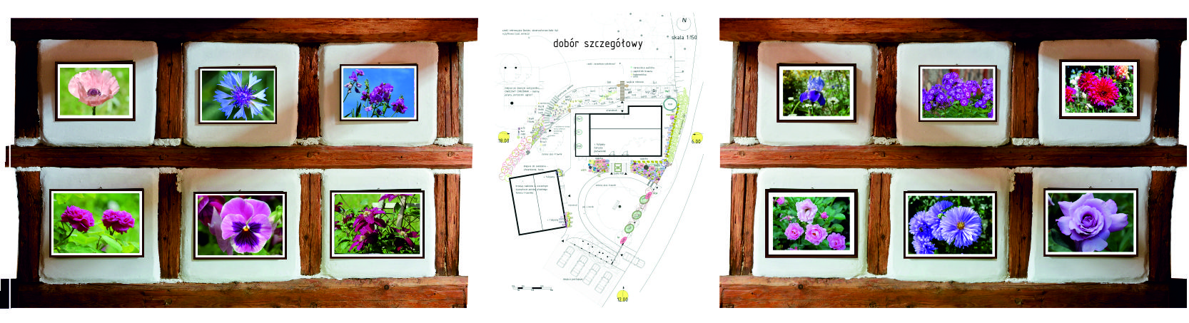 Dla urozmaicenia kompozycji wprowadzono krzewy ozdobne oraz byliny kwitnące i owocujące aż do zimy. Na rabatach kwiatowych znajdą się rośliny tradycyjne: piwonie, ostróżki, astry, kosaćce, bodziszki, orliki, szałwie, mięty, krwawniki, maki, liliowce, bodziszki, floksy, które będą atrakcyjne przez długą część roku i nie wymagają nadmiernej pielęgnacji, co potwierdziły już liczne pokolenia zwolenników tych kwiatów. Kompozycja będzie utrzymana w tonacji fioletu, błękitu, bladego różu oraz neutralnej bieli.
